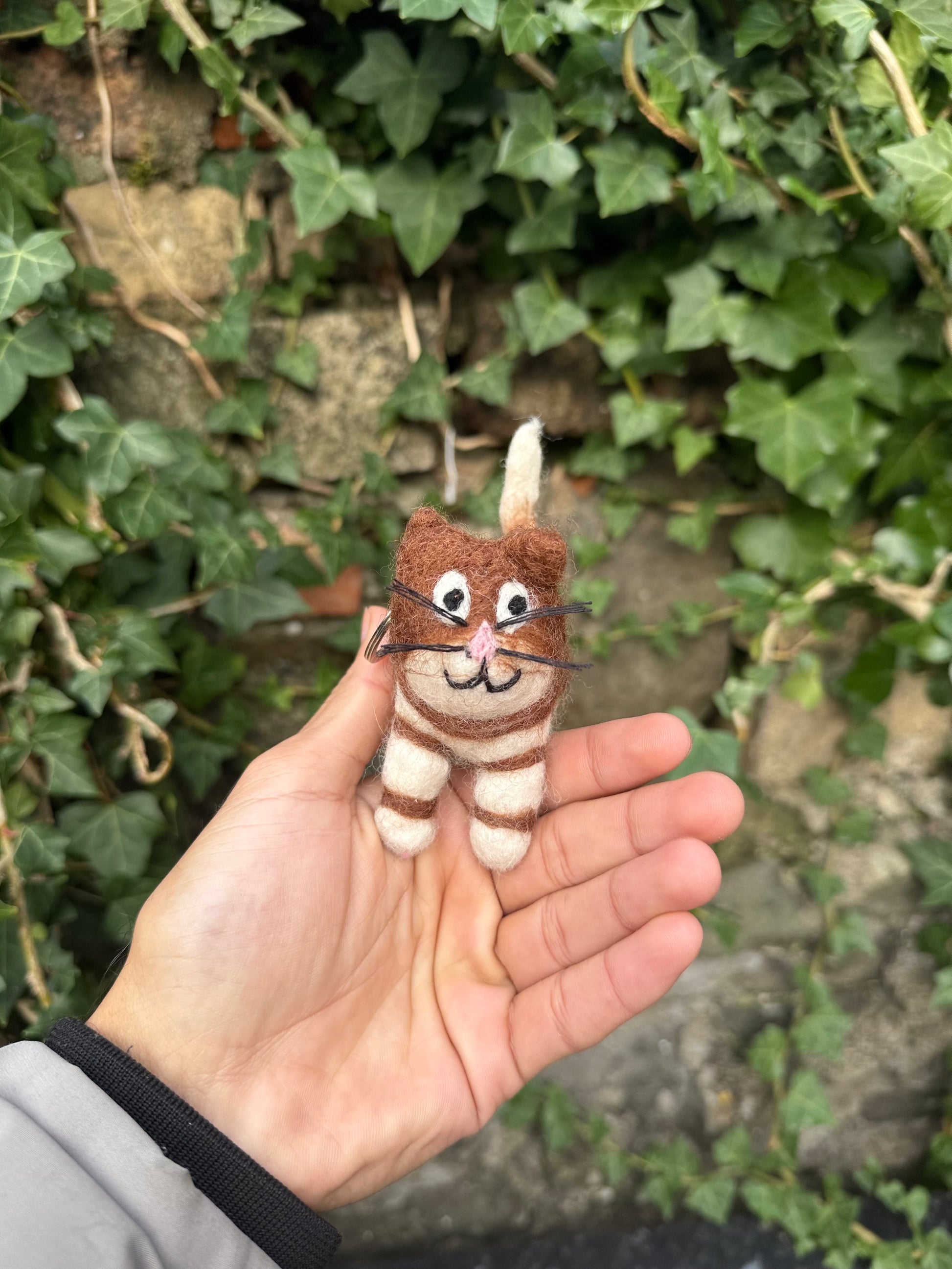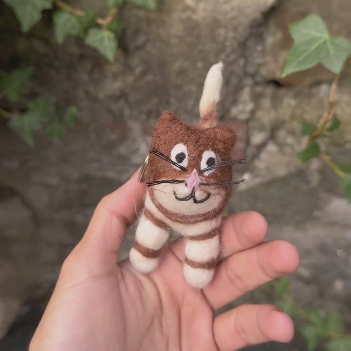 - Design: Playful brown striped cat with hand-stitched details and a cute pink nose